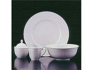 Classic soft white stoneware of Italian inspired design. This pattern of radiating column-like lines on a wide rim has a narrow embossed scroll leaf band. This 5-piece coordinating serveware set includes a serving platter, serving bowl, sugar with lid & creamer. This Italian Countryside pattern is perfect for everyday use, as well as for special occasions. There are many other accessory pieces that are available separately..